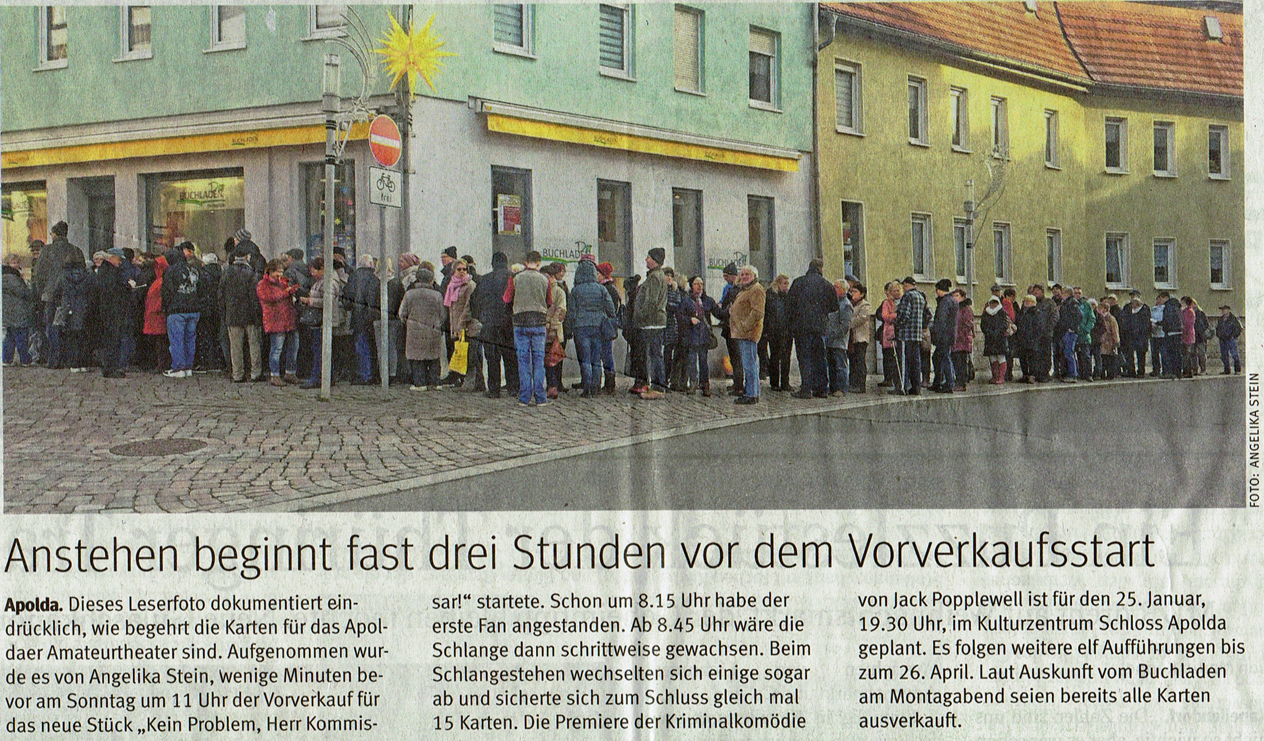 13.11.2023 Kartenvorverkauf startet! Liebe Theaterfreunde, der Kartenvorverkauf für die Aufführungen im Frühjahr 2024 startet zum verkaufsoffenen Sonntag am 03.12.2023 ab 11.00 Uhr im Buchladen Apolda.