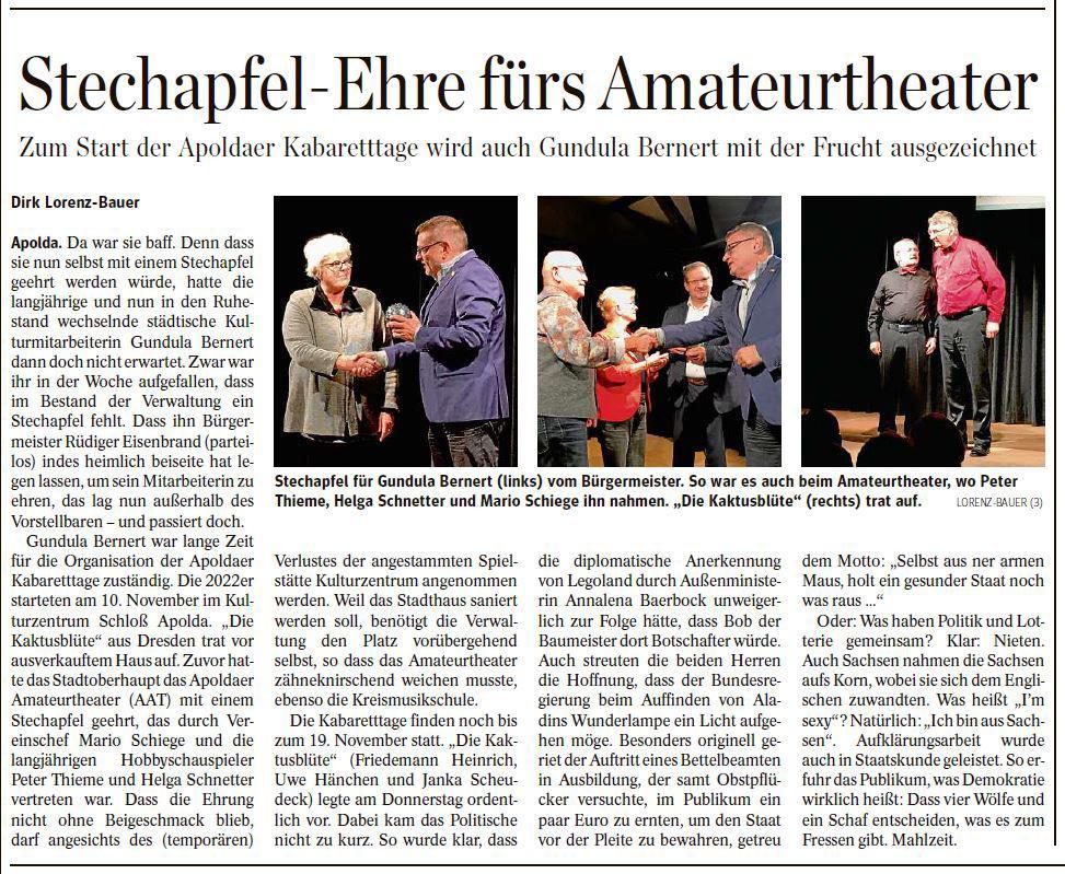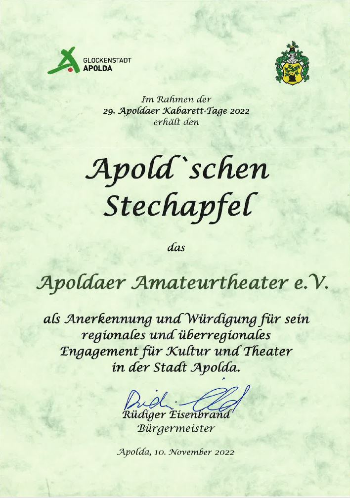 10.11.2022 Das Apoldaer Amateurtheater erhält als Würdigung und Anerkennung für sein Engagement für Kultur und Theater in der Stadt Apolda den Apold´schen Stechapfel.