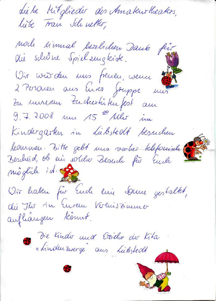 06.11.2008Der Dank der Kinder des Kindergartens Liebstedt für die vom Apoldaer Amateurtheater zur Verfügung gestellte Spielekiste 25.09.2008Ausstellungseröffnung "Erlebtes Japan" mit Frau Dr. Erika Block am 26.09.2008, 16.00 Uhr in der Geschäftsstelle der KVHS Weimarer Land in Apolda