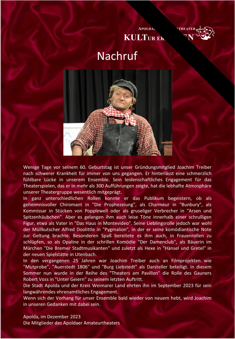 Ihm war die Bühne die Welt nach schwerer Krankheit für immer von uns gegangen. Er hinterlässt eine schmerzlich fühlbare Lücke in unserem Ensemble. Sein leidenschaftliches Engagement für das Theaterspielen, das er in mehr als 300 Aufführungen zeigte, hat die lebhafte Atmosphäre unserer Theatergruppe wesentlich mitgeprägt.