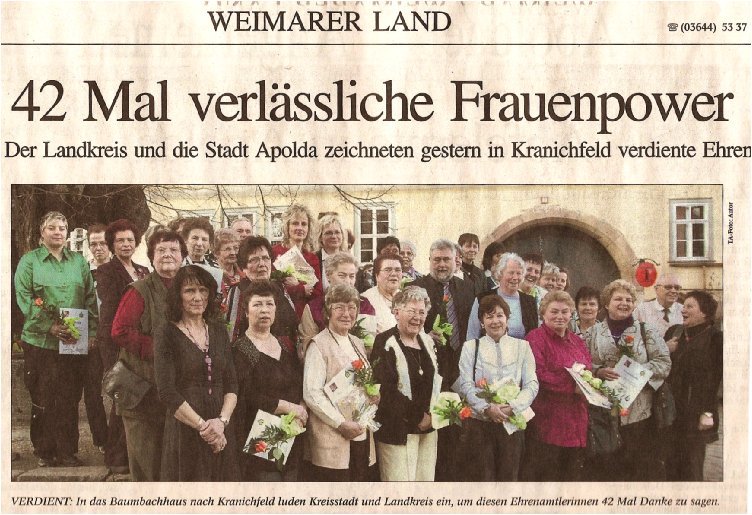 06.05.2010 Ein dickes Lob für unsere Arbeit, was uns natürlich mit viel Freude erfüllte, kam aus Erfurt. Der Chefredakteur der Thüringer Allgemeinen zu unserem Spiel... 6.03.2010Unsere Spielleiterin Dr. Erika Block wurde aus Anlass des Frauentags für Ihr ehrenamtliches Engagement geehrt. Herzlichen Glückwunsch! (Bild: TA vom 06.032010)