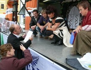 durch: Der Bürgermeister wird vom Balkon des Rathauses abgeseilt. Im Stück